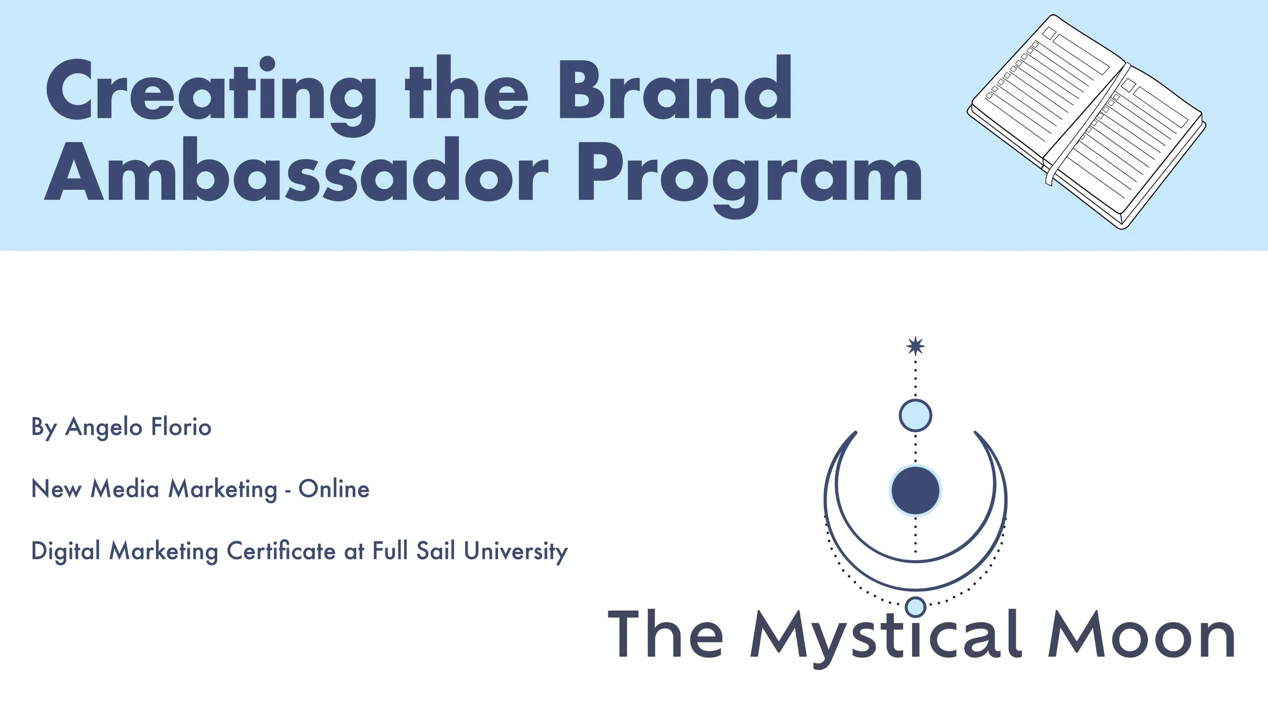 Designed a brand ambassador program plan through a Keynote presentation for my chosen business of The Mystical Moon as part of the Digital Marketing Certificate program. Incorporated digital marketing concepts including but not limited to SMART goals, defining ideal ambassadors and fans, setting a timetable, program incentives and tracking metrics.